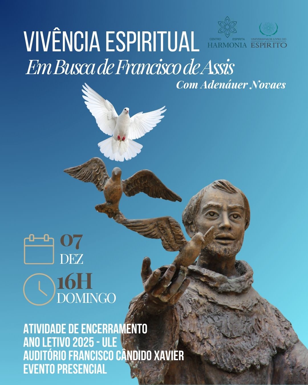 A Universidade Livre do Espírito (ULE), como atividade de encerramento do ano letivo de 2025, promoverá uma Vivência Espiritual sobre o tema: "Em Busca de Francisco de Assis", a realizar-se no dia 7 de dezembro, das 16h às 18h, no Auditório Francisco Cândido Xavier.