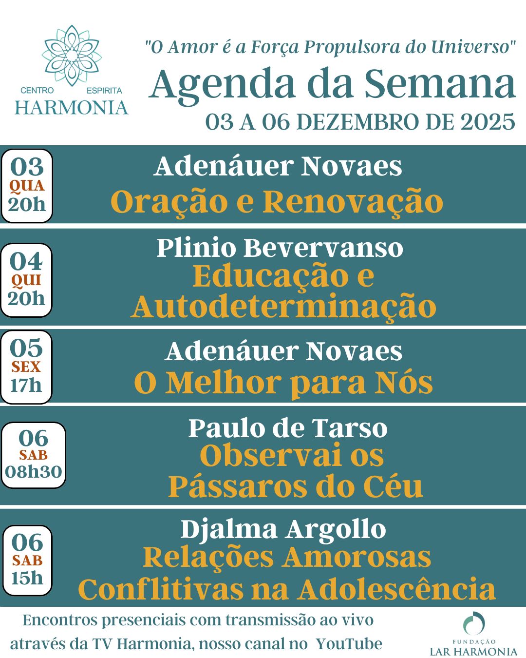 Encontros presenciais com transmissão ao vivo através da TV Harmonia, nosso canal no YouTube.